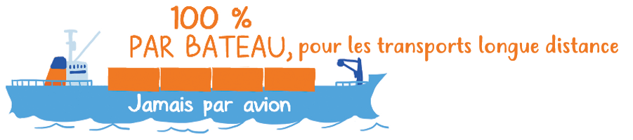 - Dans les airs : nos produits ne prennent jamais l’avion. 100% des transports longue distance se font par bateau. Nous sélectionnons les filières les plus économes en C02.