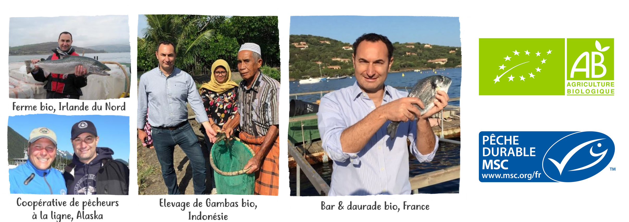 Nos poissons sont 100% éco certifiés Bio et MSC, nous sélectionnons avec exigence les espèces et engins de pêche et avons un lien privilégié avec nos producteurs. Nous donnons la priorité aux pêcheurs Français, aux coopératives et aux petits producteurs dès que possible.