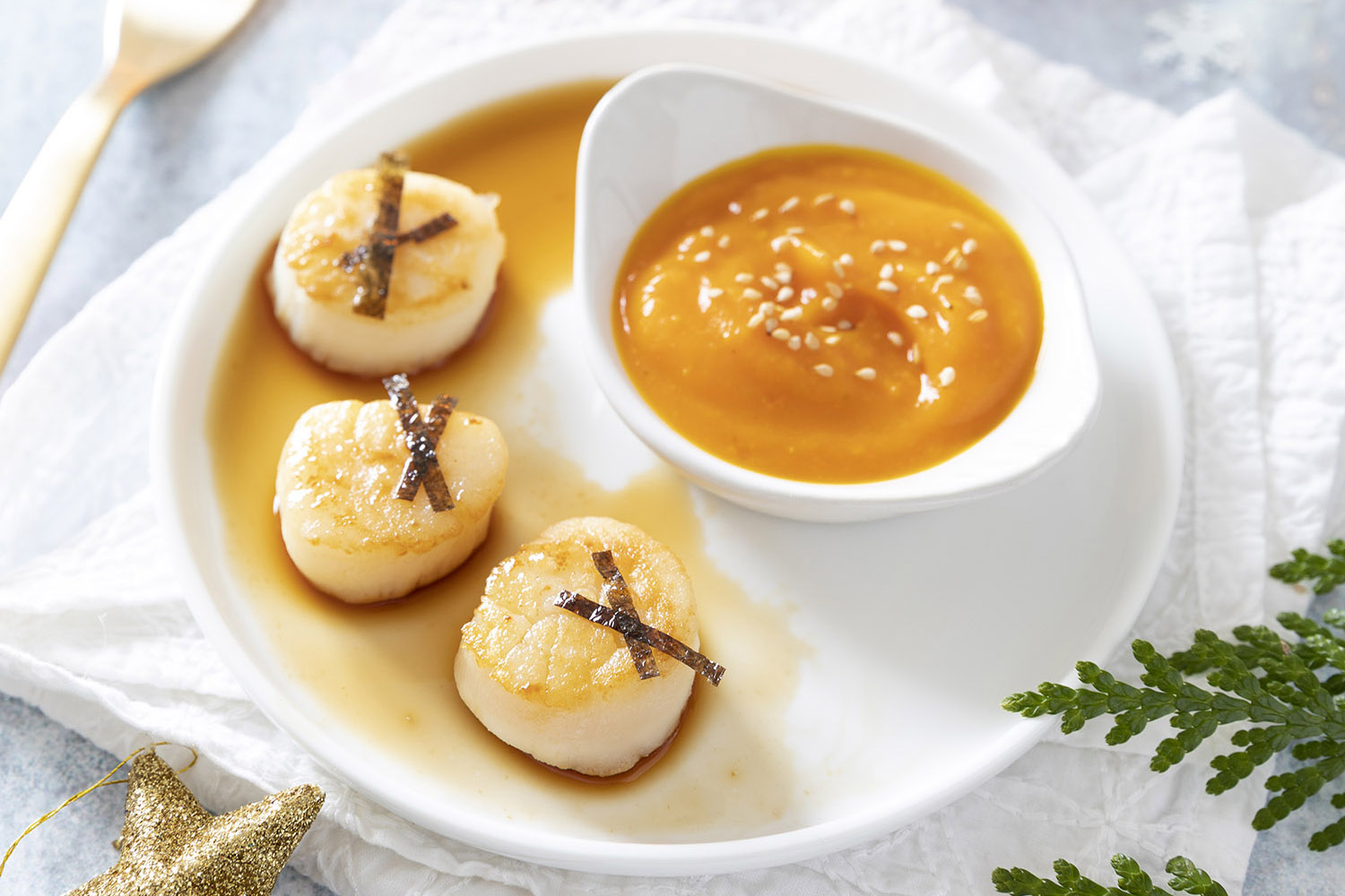 Noix de Saint-Jacques MSC rôties aux algues nori, sauce ponzu, purée potimarron à l’huile de sésame